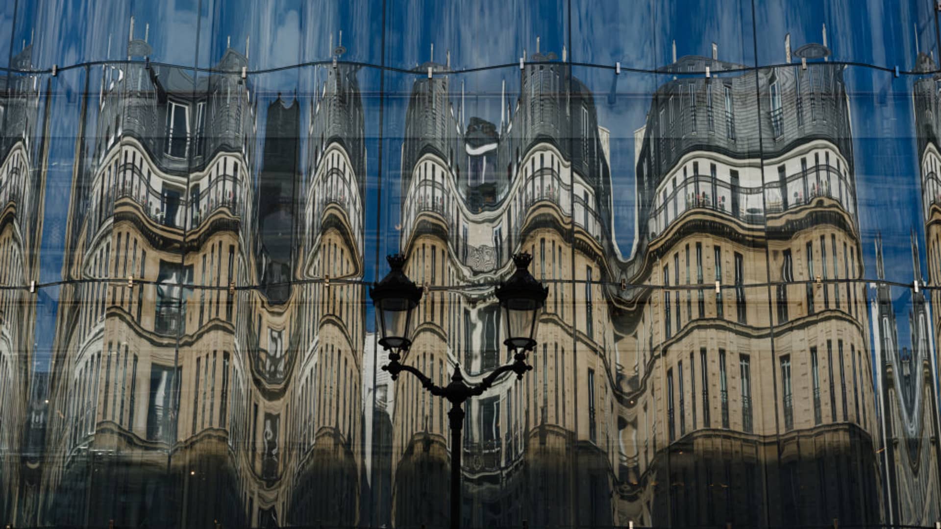 Haussmann architecture buildings ave reflected on the facade of samaritainaine department store in Central Paris on October 10, 2023.